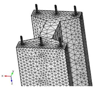 O domínio espacial de estudo no COMSOL foi composto para um segmento do poste Duplo T na área central, por uma camada de solo na parte inferior e preenchida com ar no resto do domínio. O poste foi dimensionado com 1,8 metros abaixo do solo e 10 centímetros acima, conforme ilustra a figura 4. As condições de contorno aplicadas foram de potenciais elétricos nulos em todos os limites externos da malha. O domínio foi discretizado com uma malha 3D auto adaptativa de elementos tetraédricos na escala fine do COMSOL, também observada na figura 4.