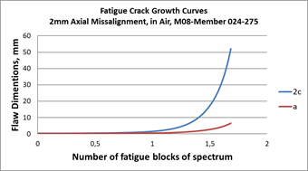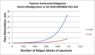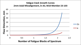 Typical initial values of Mkm solution for the cruciform join is 1.1930 for 32mm misalignment joint and 1.1788 for the 2mm misalignment. These changes in Mkm values associated with the bending moment stresses due to misalignment are the main driven parameters for the significant changes in estimated fatigue crack growth assessments reported in Figures 6 and 7.