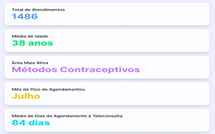 No topo da tela inicial há cinco gráficos KPIs (Key Performance Indicators, em português, Indicadores-chave de Desempenho) que trazem de modo simples e compacto a visualização de métricas comuns a todas as especialidades, sendo elas: total de atendimentos (1486), média de idade (38 anos); área mais ativa (Métodos Contraceptivos); mês de pico de agendamentos (julho); e tempo médio entre agendamento e teleconsulta (84 dias), como visto na Figura 4. Com esses dados, é possível entender o comportamento geral dos pacientes e sua demografia, bem como o maior gargalo do sistema: o grande período entre o agendamento e realização da teleconsulta.