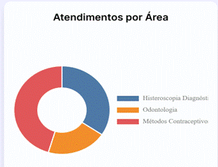 O "Dashboard de Apoio à Decisão Médica", desenvolvido com Svelte ChartJS, biblioteca para a linguagem de programação Javascript, é um painel de gestão que permite uma visualização interativa dos detalhes das consultas das áreas médicas atendidas pela telessaúde com prontuários disponíveis, sendo elas, atualmente, três: histeroscopia diagnóstica, odontologia e métodos contraceptivos. Ele destaca métricas essenciais para auxiliar o profissional de saúde na tomada de decisões com base em padrões observados nos pacientes e seus prontuários, podendo ser constantemente atualizado de forma automática, conforme novos dados de prontuários são registrados no sistema, garantindo a contínua relevância e incrementando a acurácia da ferramenta ao longo do tempo. A Figura 3 ilustra um exemplo de tela da visão geral do dashboard.
