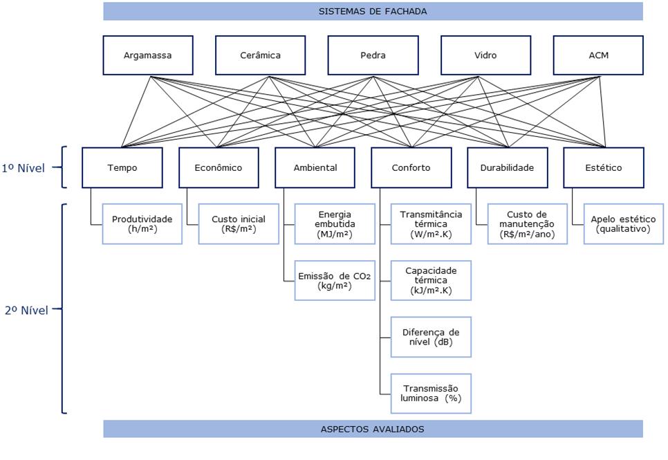 Assim, considerando-se a importância da tomada de decisão na escolha de materiais empregados em fachadas, o objetivo deste trabalho é realizar uma análise comparativa de diferentes sistemas de revestimento de fachadas de edificações: revestimento argamassado, revestimento cerâmico, revestimento em granito, vidro e ACM (Aluminium Composites Materials). Para isso foi aplicada a metodologia de análise hierárquica com base em parâmetros como: tempo, economia, agressividade ao meio ambiente, conforto, durabilidade e estético; sob três diferentes pontos de vista: Engenheiros, Arquitetos e Consumidores. Neste sentido, este trabalho visa contribuir para a substituição das decisões de caráter subjetivo e evidenciar, dessa forma, os aspectos técnicos e objetivos para a análise e decisão entre esses cinco tipos de revestimento. O uso desta ferramenta para seleção de materiais já foi publicado por Mattana et al. [4], porém, com um enfoque diferente, pois nesta pesquisa não foi avaliado o aspecto ambiental e econômico e as opções de escolha eram as proporções de mistura de argamassas de revestimento apenas, diferente do trabalho atual que compara opções de sistemas de revestimentos adicionais considerando aspectos abrangentes como sustentabilidade, durabilidade e conforto (não considerados no estudo anterior).