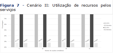 É importante descrever como o escalonamento dos recursos se comportou para o ECS neste terceiro cenário, onde, a partir da carga de 20 usuários, o ECS já observou sobreutilização dos recursos e inicializou outro contêiner. Assumindo 30 e 50 usuários foram inicializados os três possíveis contêineres. Desta forma, com até 3 serviços executando em paralelo e processando requisições, o ECS conseguiu melhor no desempenho que o EC2, mesmo que este, possuísse recursos superiores disponíveis durante todo o experimento, porém, com apenas um serviço para lidar com as requisições simultâneas.