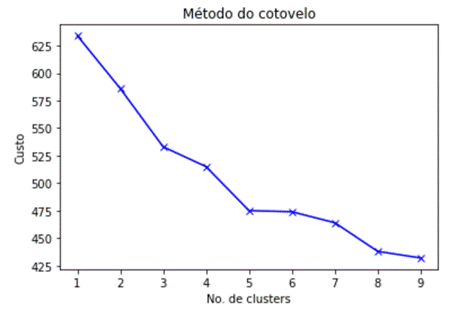 Como o k-modes não é um algoritmo hierárquico, então é necessário estabelecer um número de clusters para que seja inicializado o algoritmo. O número ótimo de agrupamentos usualmente é obtido utilizando o método do cotovelo [18].