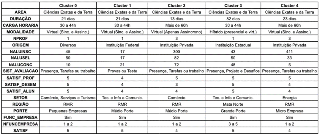 As características mais frequentes de cada um dos 5 clusters obtidos, estão no apêndice A.