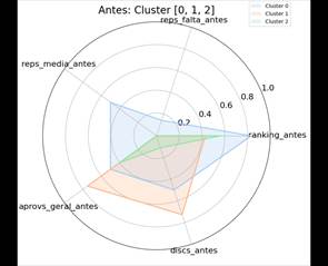 A análise dos três clusters demonstra perfis distintos de desempenho acadêmico dos alunos antes do estágio, conforme ilustrado no Gráfico 7. O Cluster 0, com 64 indivíduos, apresenta um perfil acadêmico equilibrado, com bom desempenho no ranking geral (0.8) e um número moderado de disciplinas cursadas (0.6), refletindo um envolvimento significativo no ambiente acadêmico. As reprovações por média e por falta são baixas (entre 0.2 e 0.4), indicando boa frequência e esforço para atingir as médias mínimas. No entanto, as taxas de aprovação geral são moderadas (entre 0.4 e 0.6), sugerindo que, embora os alunos sejam assíduos e engajados, enfrentam dificuldades em transformar esse esforço em maior aproveitamento.