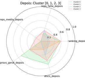 Em outra perspectiva, o Gráfico 8 apresenta a análise dos clusters após o estágio em perfis distintos de desempenho acadêmico entre os alunos. O Cluster 0, com uma população de 52 indivíduos, apresenta o menor número de alunos entre os grupos analisados após o estágio. Esse cluster demonstra desempenho muito limitado em todas as variáveis analisadas. As taxas de aprovação geral (0.2) e o número de disciplinas cursadas (0.2) são baixos, indicando baixo engajamento acadêmico e dificuldades consistentes no progresso nas disciplinas. As reprovações por falta próximas a 0.4, o que pode indicar uma participação limitada, mas sem grandes faltas. Esse grupo reflete alunos que precisam de suporte acadêmico intensivo e estratégias personalizadas para melhorar o engajamento e a retenção de conteúdo.