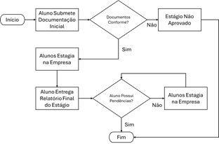 A Figura 1 apresenta o fluxograma que descreve de forma geral o processo de estágio obrigatório na POLI. O esquema ilustra as etapas principais, desde a submissão inicial da documentação pelo aluno, passando pelas verificações necessárias, até a conclusão do processo com a aprovação final, após o cumprimento de todos os requisitos.