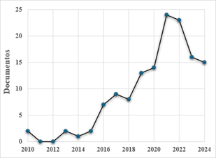 Desde então, a pesquisa sobre biochar no Brasil tem experimentado um crescimento, alcançando seu ápice em 2021, o ano com o maior número de publicações sobre o tema, totalizando 24 artigos. Este aumento notável em 2021 pode ser atribuído ao renovado interesse e ao reconhecimento da importância do biochar para a agricultura sustentável, a remediação ambiental e a mitigação das mudanças climáticas. Os estudos publicados nesse período abrangem uma ampla gama de tópicos, incluindo a influência de diferentes tipos de biomassas e das variáveis envolvidas no processo de produção do biochar, como explorado por [20] em seu estudo sobre a produção e caracterização do biochar obtido a partir de diferentes biomassas e temperaturas de pirólise.
