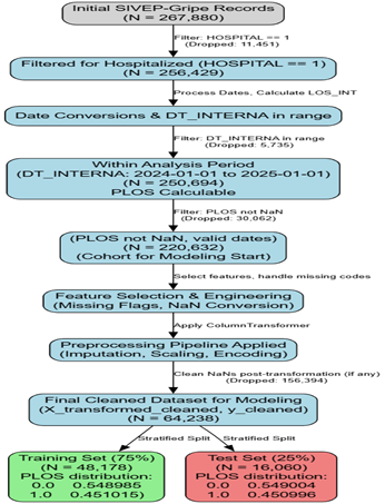 For this study, the initial dataset was filtered to include only patients who were hospitalized due to SARS, identified by the HOSPITAL variable (Value: 1 = Yes). The analysis focused on admissions occurring between January 1, 2024, and January 1, 2025, based on the DT_INTERNA (admission date) field. The primary outcome, Prolonged Length of Stay (PLOS), was derived from DT_INTERNA and DT_EVOLUCA (outcome date), defined as a hospital stay exceeding 7 days.