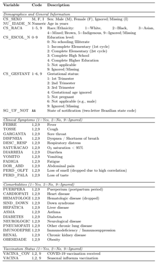 A curated set of features relevant to SARS patient demographics, symptoms, comorbidities, and vaccination status was selected for model development. This selection was guided by domain knowledge and common practices in SARS research. Specifically, features included CS_SEXO (sex), NU_IDADE_N (age in numbers), CS_RACA (race/ethnicity), CS_ESCOL_N (education level) CS_GESTANT (gestational status), symptom indicators (FEBRE, TOSSE, etc.), comorbidity flags (CARDIOPATI, DIABETES, etc.), and vaccination details (VACINA_COV, VACINA). The state of notification (SG_UF_NOT) was also included for potential regional analysis.